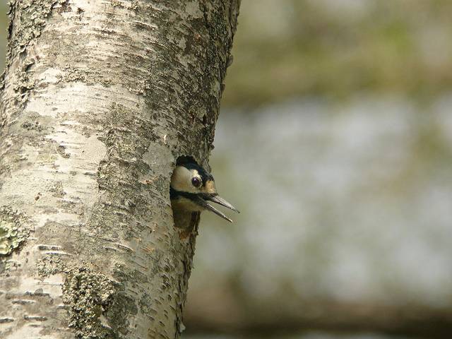 巣作りの真っ最中。顔を出して木くずを外へ出しているところです。 |