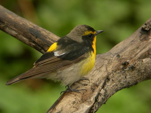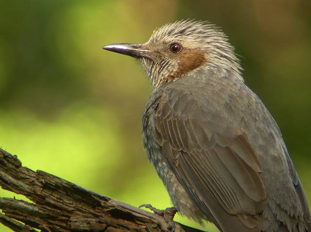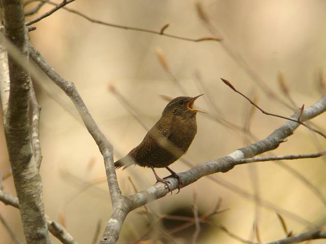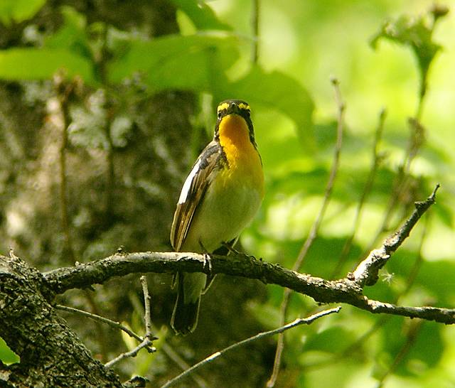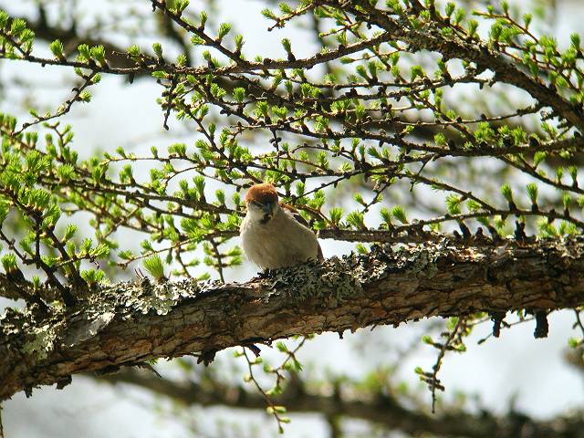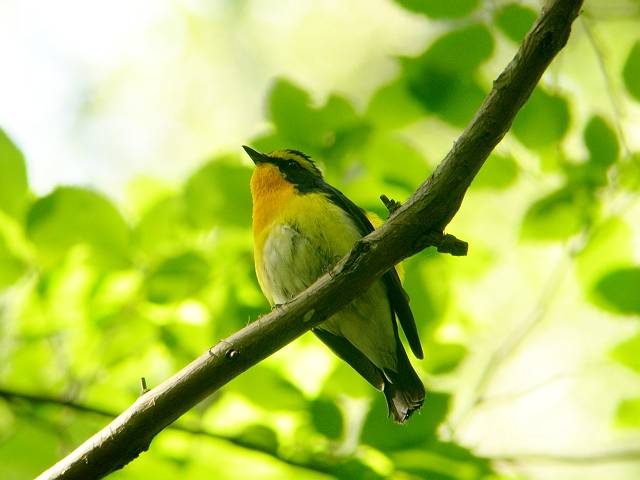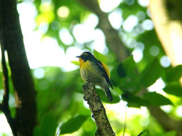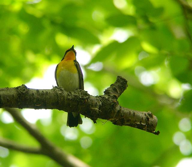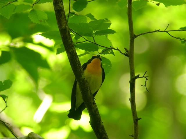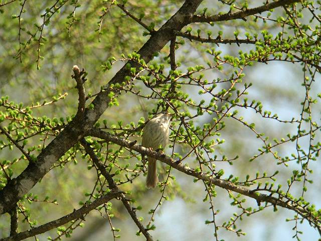 木の枝の低いところで見つけました。早朝だからでしょうか,鳴いていませんでした。 |