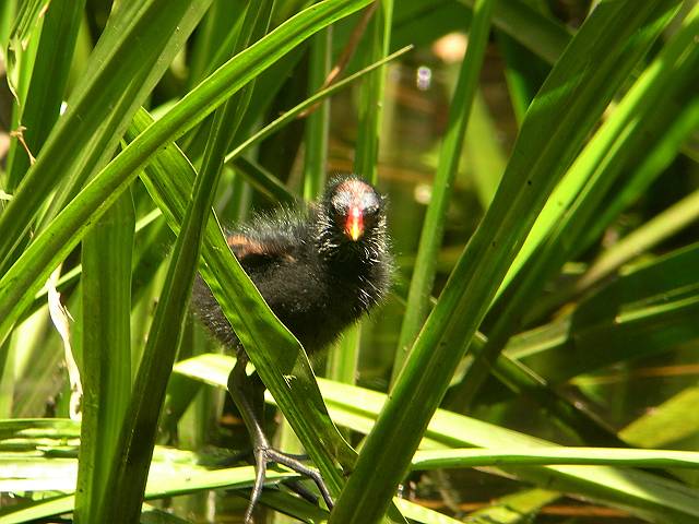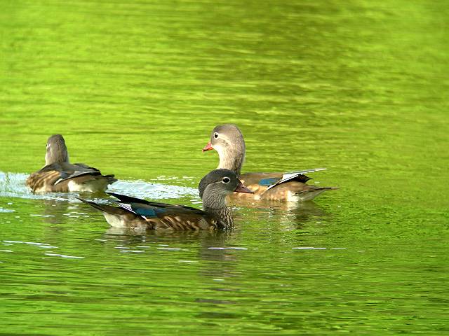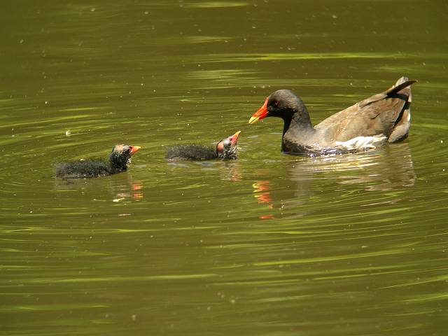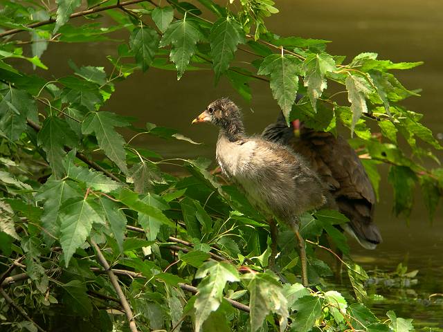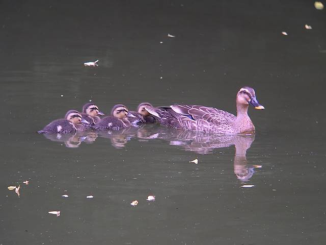 泳ぎもずいぶん達者になったようです。池の真ん中まで親について行ってます。 |