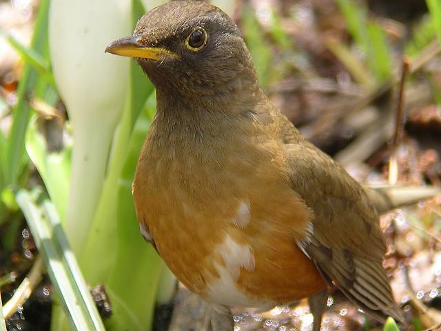 キョロン、キョロンという囀りを良く聞きました。このアカハラは水芭蕉のあるところで長い時間採餌していました。デジスコのピントが合わない距離までも平気で近づいてきました。 |