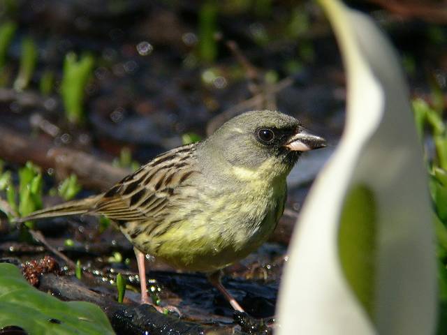 このアオジは水芭蕉のある湿地に降りて、長い時間採餌していました。 |