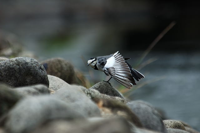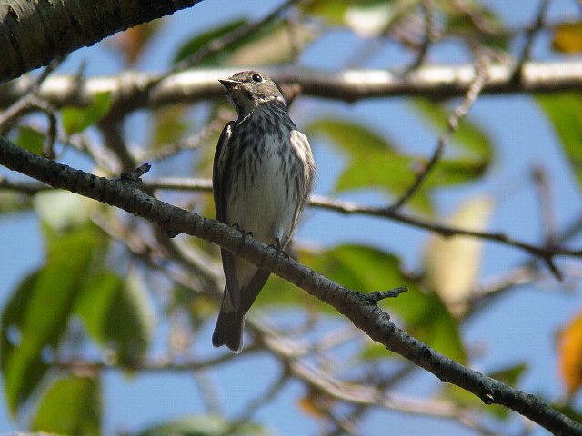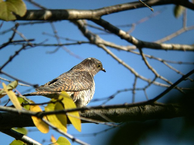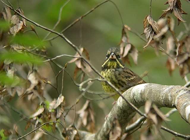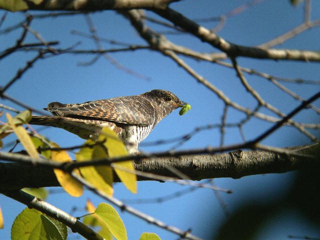 地面に降りて採餌していたようです。近づくと、さっと枝に飛び上がりました。しばらく見ていたら、枝移りして大きな青虫を捕まえました。 |