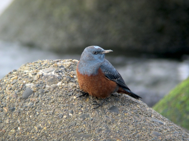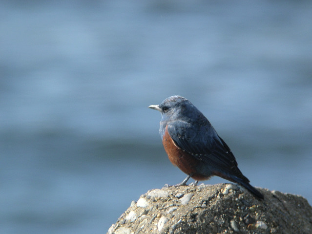 イソヒヨドリは、運良く、雄雌両方を観察することができました。雄は2羽いたように思います。雌は1羽のみ確認しました。観察していると、ブロックの下の方へ行って小さな蟹を捕ってきて食べ始めました。