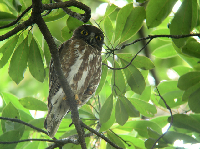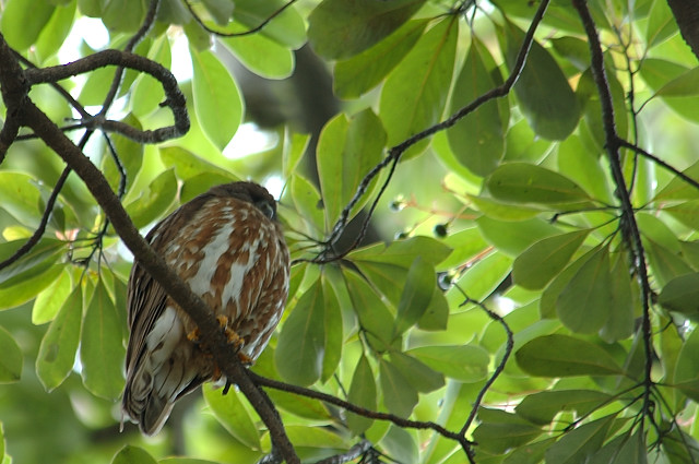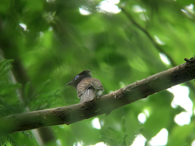 今日のアオバズクです。変わった様子もなく、いつもの枝にとまっていました。私に一瞥(いちべつ)するとすぐに、目をつぶってしまいました。 |