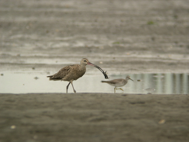 シロチドリ(たぶん)とホウロクシギ(たぶん)は早朝です。潮の引いた砂浜を、無謀にも運動靴で、少し沖に向かって歩いて行って撮影しました。ホウロクシギのくちばしは本当に長いなあと思います。