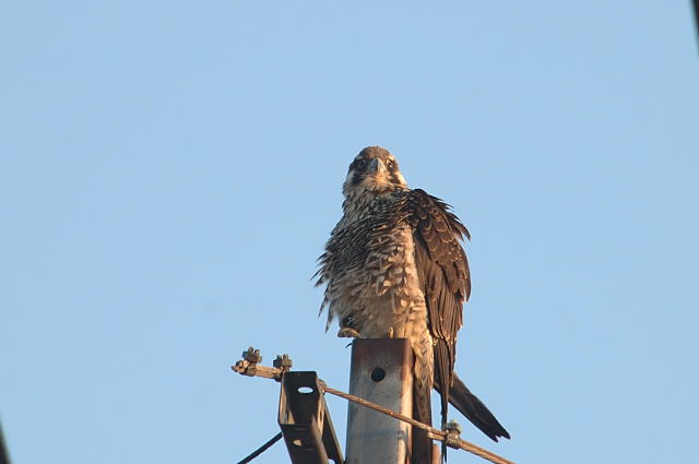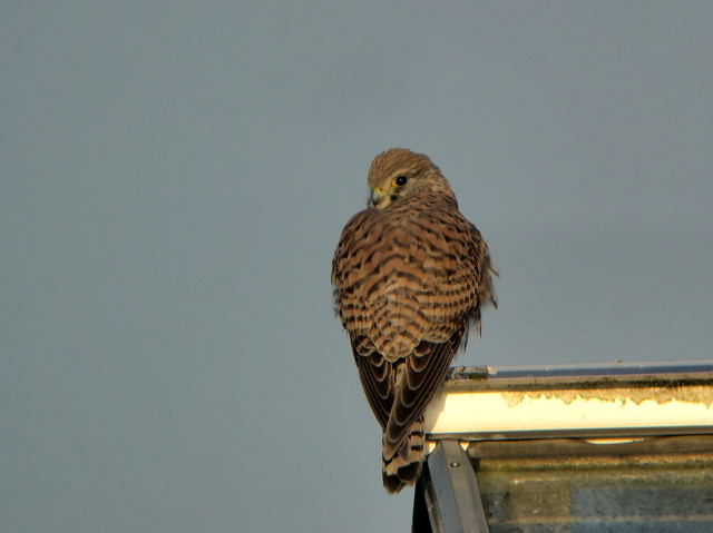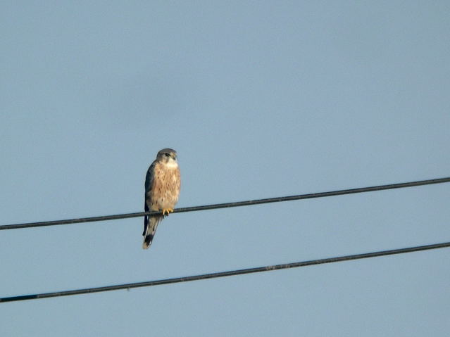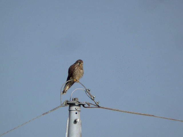 目当ての猛禽には会えませんでしたが、チョウゲンボウが相手をしてくれました。農家のハウスの屋根に止まって、羽繕いをしていました。そのうち、おしりを向けて糞をしたかと思ったら電柱の方へ飛び、距離をあけられました。