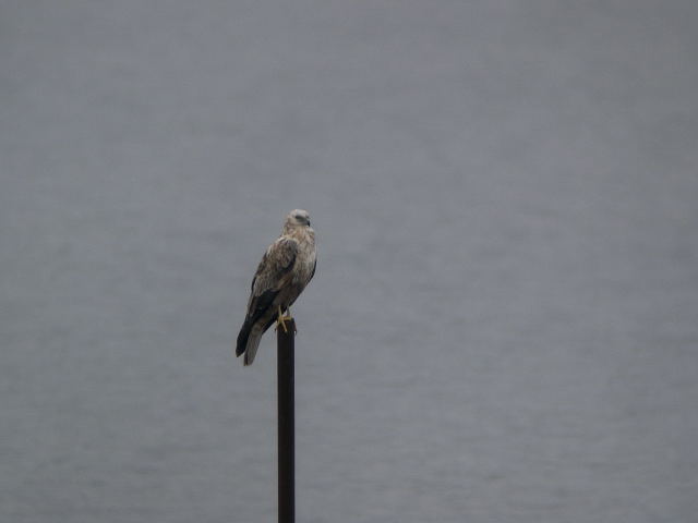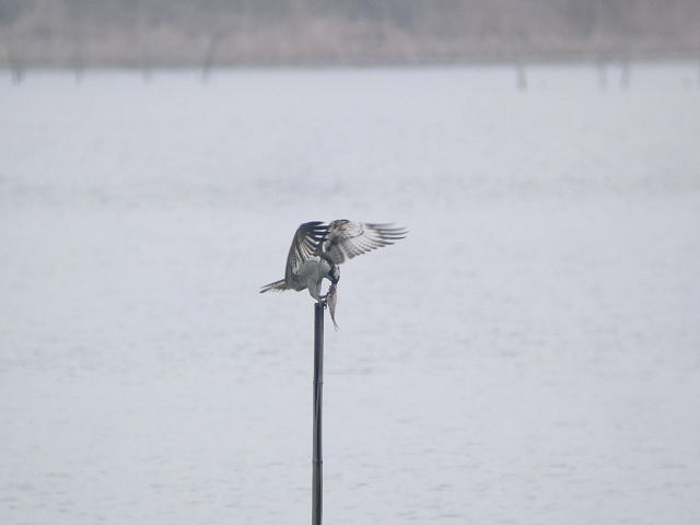 ミサゴは獲物の魚をつかんで飛んでいました。飛翔姿をとらえたかったのですが、距離がありすぎました。杭にとまって、食べ始めたところ撮しました。