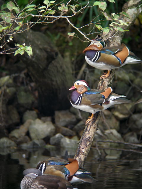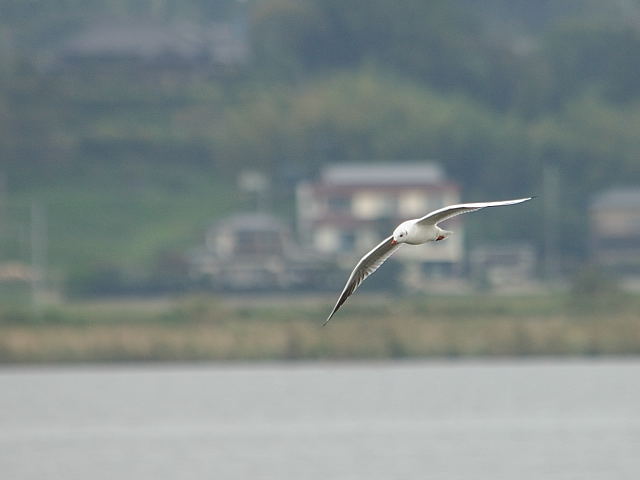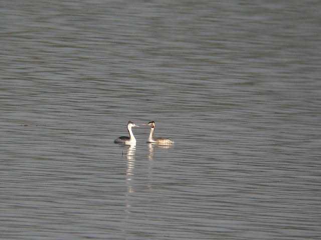 沼は、風もなく穏やかな水面でした。遠くの方にカンムリカイツブリが3羽見え隠れしていました。 近くの灌木にはいつものモズが止まり、テリトリーを主張するように鳴いていました。