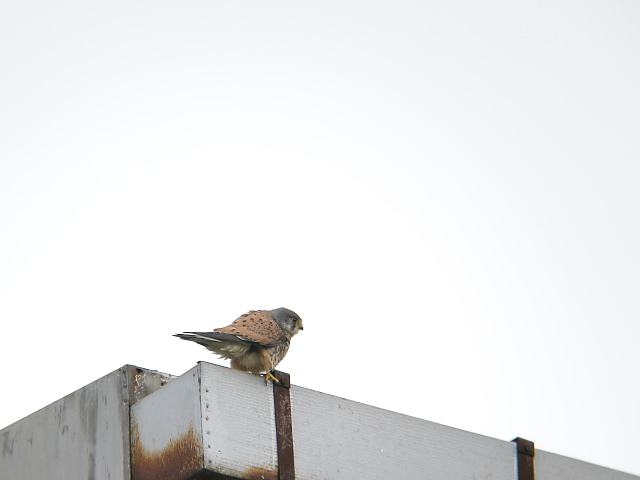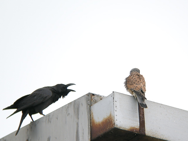 チョウゲンボウはカラスから攻撃を受けていました。カラスは威嚇しながら距離を縮めていましたが、チョウゲンボウのほうはよほど近づいてこなければ、へっちゃらの様子でした。