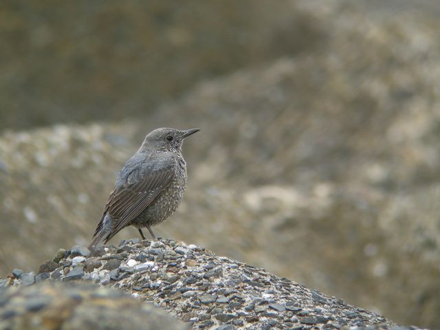 イソヒヨドリは偶然出会いました。イソシギを追いかけて行くと、イソヒヨドリが消波ブロックに姿を現しました。なんとか距離を縮めて、撮らせてもらいました。目をつけたイソシギは、少し向こうのブロックへ飛んで行きましたが、まもなく二羽で戻ってきました。一羽がそのまま飛び去り、もう一羽は飛んできた方へ戻って行きました。どうやら縄張りに進入してしまったようでした。