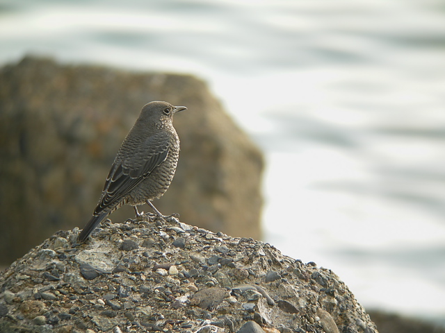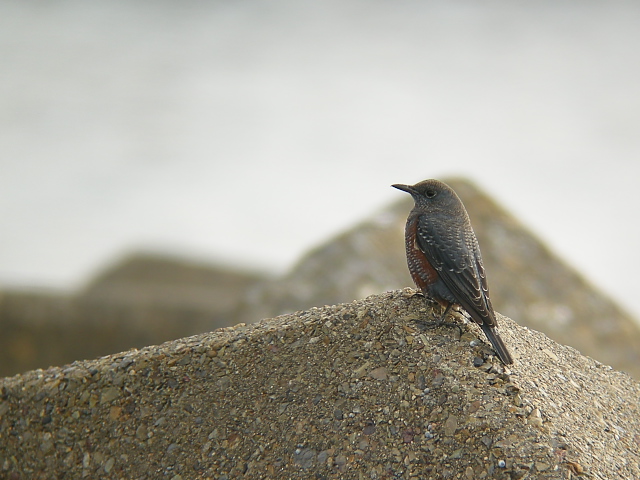 海岸に移動すると、イソヒヨドリが消波ブロックにとまり、ときどきフナムシなどを食べていました。少し離れて雄も見かけました。