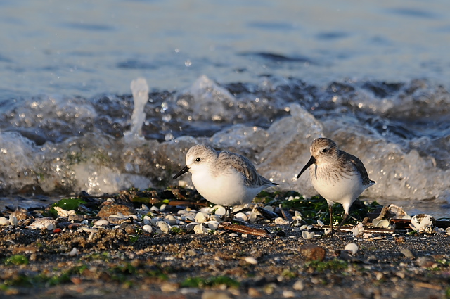ミユビシギにハマシギが混じった小さな群れが、波打ち際で採餌していました。