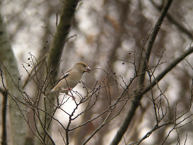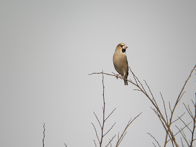午後から少し日差しが出たのですが、姿を現す野鳥は多くはありませんでした。しばらく待つと、灌木にシメがとまりました。