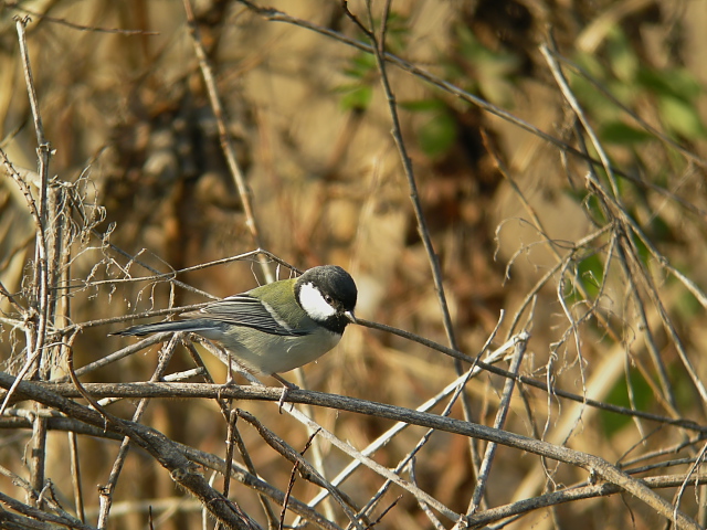 シジュウカラは枝や蔓が込み入っているところで採食していました。よく動くのですが、偶然写せました。