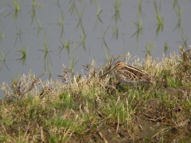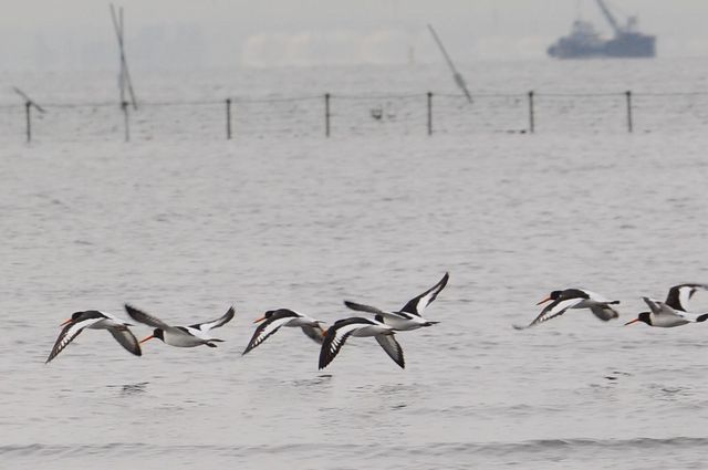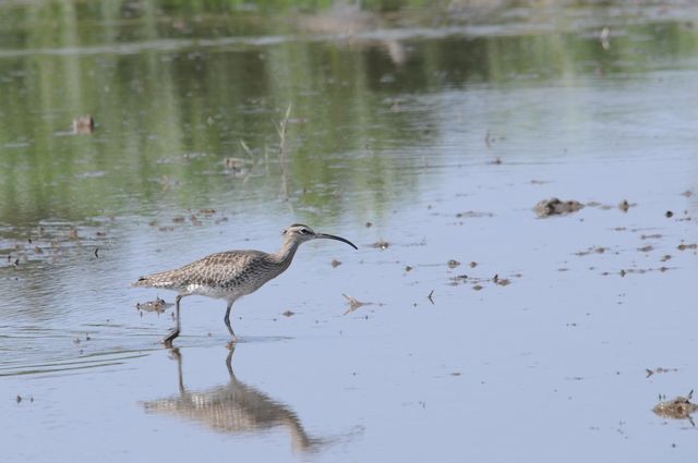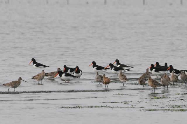 09.04.18 三番瀬 ・オオソリハシシギ ・オオソリハシシギとミヤコドリ ・ミヤコドリ (NikonD300 80-400mm 3枚とも) あと2時間もすると、ちょうど満潮という潮の時間でした。ミヤコドリの群れが、近くで採食していて左側へ移動していきました。するとそこへ、オオソリハシシギの群れがやってきました。三脚を忘れなければ、スコープでも見ることができたのに残念。 |