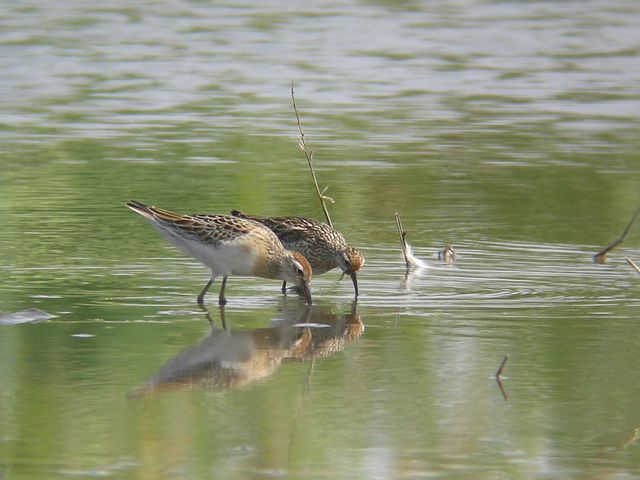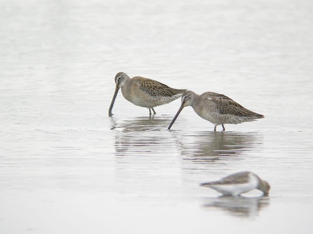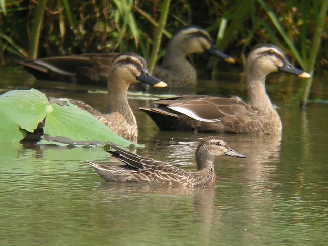 09.09.28 稲敷市 ・クサシギ ・シマアジ(手前) ・オグロシギ ・オグロシギ ・ウズラシギ(と思います) クサシギが遠くの方に見えました。強い日差しの下にいるのはつらかったのですが、しばらく観察しました。オグロシギの群れが遠くに降りて近づいてきたからか、クサシギも写せる距離まで来てくれました。ウズラシギ(と思うのですが)もクサシギと同じようにこちらのほうに移動してきました。 カルガモやコガモに混じってシマアジがいました。 |