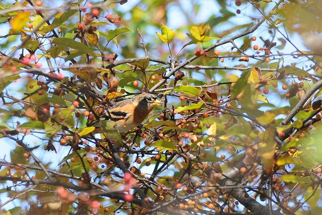 10.10.11 栃木県 ・ノビタキ ・エゾビタキ ・シジュウカラ ・アトリ 3,4枚目はD300 300mmF4×1.4 遠くの草紅葉の中にノビタキを見ました。草の中から飛び上がって灌木の枝にとまったり、また草の中へ降りたりしていました。 休憩ようの椅子があるところでは、エゾビタキを見ました。少しの間とまっていたかと思うと飛んでしまうのですが、遠くへはいきません。休憩しながら、楽しませてもらいました。 ハイカーの中にはバードウォッチャーもいて、声をかけると、マミチャジナイがいるというのです。残念ながら、どこかへ飛び去ったようで、かわりにアトリが木の実を食べていました。 他には、シジュウカラやエナガ、ゴジュウカラ、アオゲラを見ました。 |