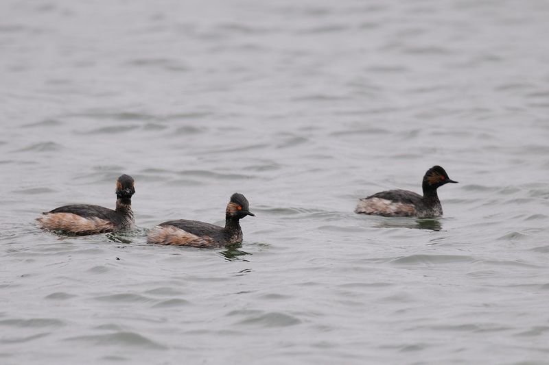 13.03.10 千葉県 ・カンムリカイツブリ ・ミミカイツブリ 夏羽のカンムリカイツブリが、だんだんと近づいてきました。頬の赤褐色と黒の飾り羽がきれいです。 遠くのクロガモやアビらしき海鳥をみていると、ミミカイツブリも近くに来ていました。ミミカイツブリの夏羽も見てみたいなと思います。 |