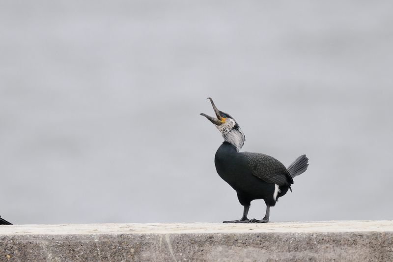 13.03.30 銚子 ・ウミウ ・カモメ ・カモメ ・セグロカモメ ・ウミネコ ・カンムリカイツブリ ・ハジロカイツブリ いつもだと、ちらりとしかみていない鵜を今日は少しだけ時間をかけて見ました。コンクリートにずらりと並んだ鵜。その中の一羽が、口を開いて顔を上に向けて吠えるような仕草を始めました。何かなと思って見ていると、おしりから白い糞がぴゅうっと飛び出ました。また、別の鵜は曇り空の中、羽を広げて乾かしていました。カワウとウミウ、私には判断がなかなかつきにくいのですが、黄色い部分の形などからウミウと思います。 ウミネコが金属の柵に止まっていましたが、白色がとても美しく見えたので思わず写していまいました。 |
