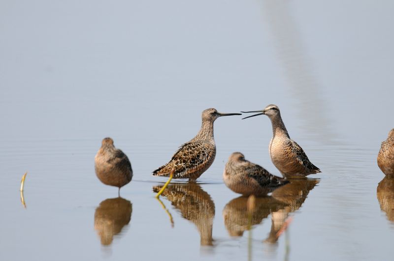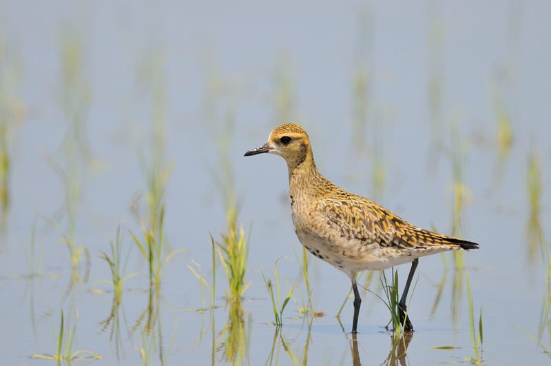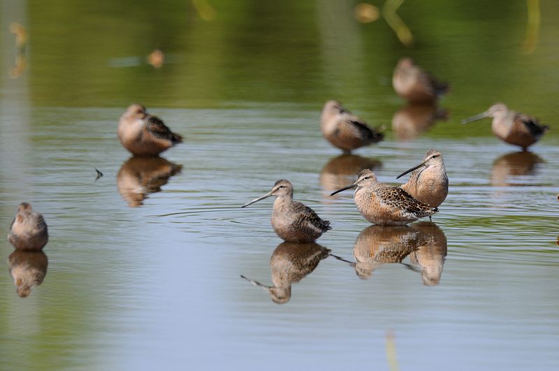 13.05.03 稲敷市 ・オオハシシギ ・オオハシシギ ・ウズラシギ ・ムナグロ ・ムナグロ ・オバシギ ・キョウジョシギ ・トウネン 良い天気で、田んぼや蓮田のシギたちを気持ちよく見てきました。 蓮田にはオオハシシギが20羽以上はいました。偶然写した写真を見ると、クチバシの先が反り返っています。柔らかいんですね。 田んぼには、たくさんのムナグロの中にトウネンやウズラシギ、キョウジョシギ、オバシギなどが混じっていて、特に春のウズラシギは私にとって初めての出会いでした。 遠くの田んぼにはチュウシャクシギの群れが羽を休めていました。 |