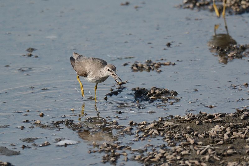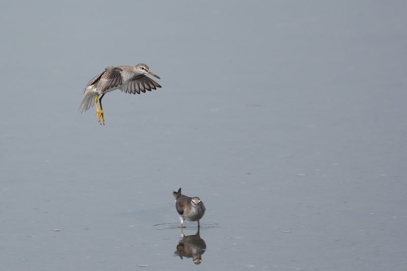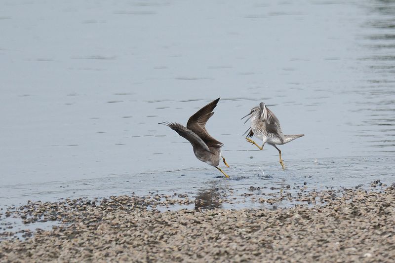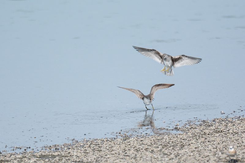 13.08.03 谷津干潟 ・キアシシギ ・キアシシギ ・キアシシギ ・キアシシギ ・キアシシギ ・メダイチドリ 谷津干潟にいってみました。サギたちが池や干潟にたくさん姿をみせ、キアシシギのピュイーという声が聞こえてきました。 水に沈んでいない砂地の周りで、キアシシギやメダイチドリ、キョウジョシギ、ミユビシギを見ました。キアシシギはカニなどをとっていましたが、仲間が近づくと、ときどき相手を牽制するような動きもしていました。 |