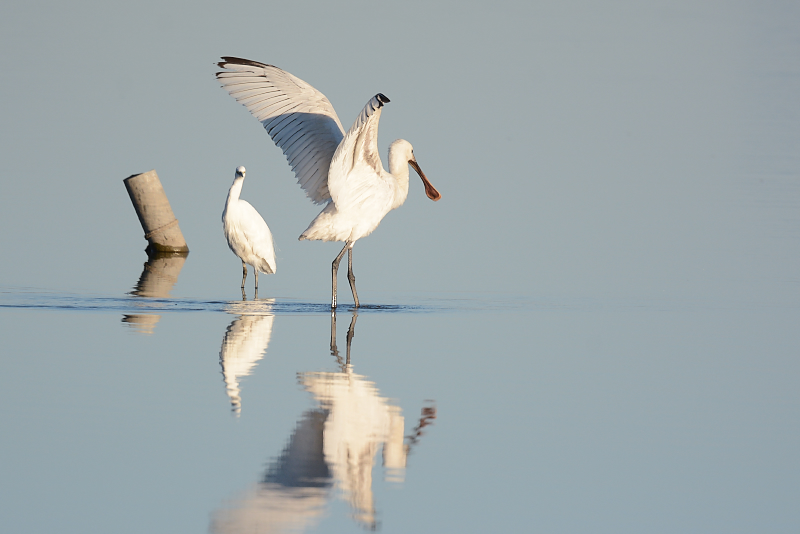 13.11.30 埼玉県 ・ヘラサギ ・ヘラサギ ・カイツブリ 日が昇る前の薄暗い時間から採餌していました。おおきなへら形の嘴を開いて水の中につっこみ、左右にふりまわすように餌をとっていました。おおきな嘴は水から引き上げると、やや重そうであつかいにくそうな印象です。ようやく明るくなってきた頃には羽繕いを始めて、そのうち寝てしまいました。 帰り際、駐車場で所沢ナンバーの方に声をかけられ、きゅうい、獅子ゆず、柿などをいただきました。ごちそうさまでした。 |