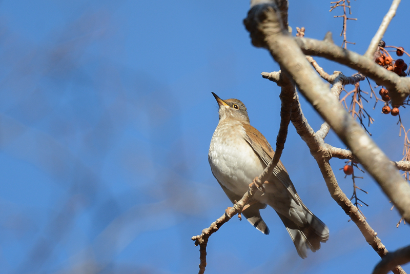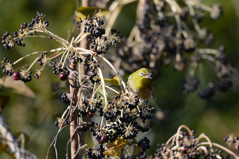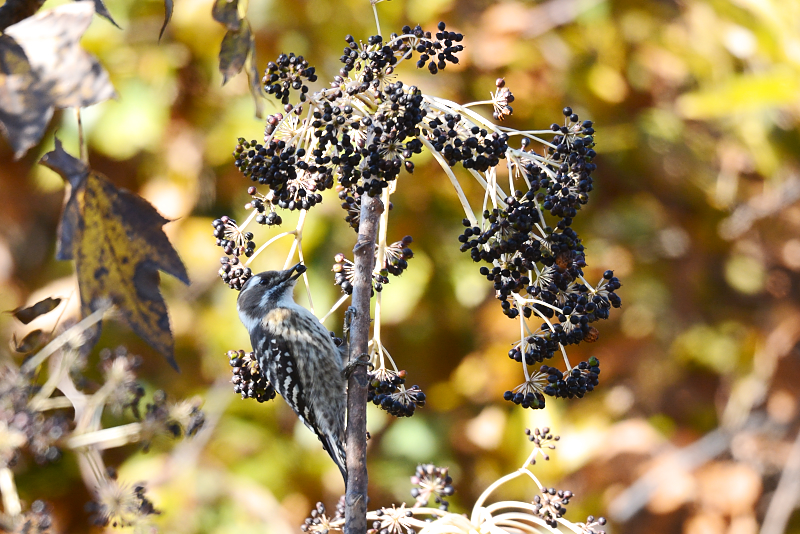 13.12.01 千葉県 ・ルリビタキ ・メジロ ・コゲラ ・ツグミ ルリビタキは、縄張り争いをしているようでした。藪の中の2カ所から声が聞こえ、そのうち1羽が姿を現しました。 ハリギリの実でしょうか、たくさん実をつけた木にメジロやコゲラが頻繁にやってきていました。そのうちツグミまでやってきました。メジロやコゲラの大きさに目が慣れた頃だったので、ずいぶん大きく感じました。 |