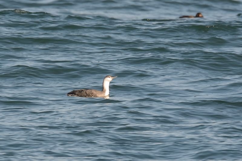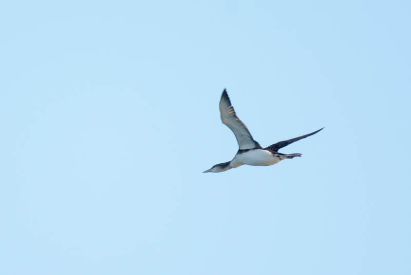 14.01.11-12 九十九里浜 ・アラナミキンクロ ・アラナミキンクロ ・ミサゴ ・カワウ ・ノスリ ・アビ アラナミキンクロは、肉眼で探すには遠い距離にいました。スコープで探すと、ビロードキンクロの群れから少し離れていました。額や後頸に白い部分があるので、遠くからだと白色が目立ち、嘴が独特の色や模様をしていて、ユーモラスな鳥に見えます。まれな冬鳥とされていますが、見ることができて感激しました。 近づいてくるのをしばらく待ちましたが、多くの観察者や釣り人やサーフィンをする人たちもたくさんいることもあり、期待にこたえてくれることはありませんでした。上空をミサゴ、カワウ(でしょう)、ノスリが飛び、アビが突堤に近づいてきました。 |