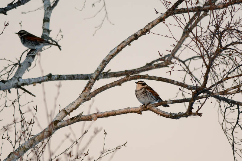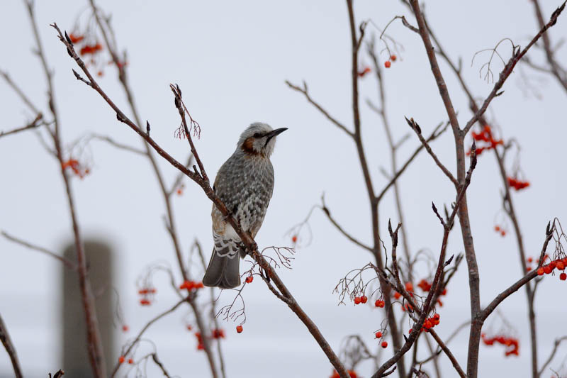 中標津町 ・アカゲラ ・ホオジロガモ ・ハシブトガラ ・ヒヨドリ ・ツグミ 町の公園とその近くをぶらぶらしてみました。公園の池にホオジロガモが一組入っていました。あまりにも近づきすぎたので、飛ばれてしまいましたが、ここでホオジロガモを見たのは初めてでした。 街路樹のナナカマドは真っ赤な実がついていて、ヒヨドリやツグミがたまにきていました。 |