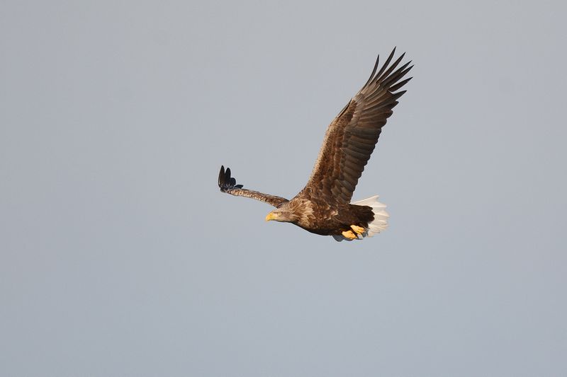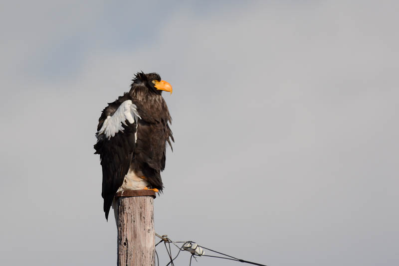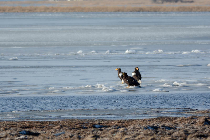 標津町・中標津町・別海町 ・シノリガモ ・オジロワシ ・オオワシ ・オオワシ ・ホオジロガモ ・ホオジロガモ ・コオリガモ ・コオリガモ ・ワシカモメ ・ミヤマカケス 低気圧が通り過ぎ、天気が良くなったので再び漁港と野付半島に行きました。漁港では、シノリガモ、コオリガモ、ホオジロガモ、カモメ類などをみました。 野付半島では氷ったところもあり、その上にオオワシの姿を、上空にはたくさんのトビやオジロワシを見ました。 20〜30羽のハギマシコの群れを見ましたが、近づくと飛ばれてしまいました。私の頭のすぐ横を速いスピードで通り過ぎて行きました。 神戸や愛知ナンバーの車も見かけましたが、鳥見の人たちだったのでしょう。 |