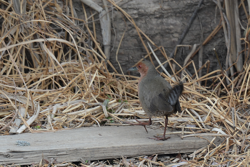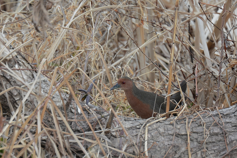 14.02.02 千葉県 ・ヒクイナ ・ヒクイナ ・モズ ・ノスリ ・ルリビタキ ようやくヒクイナの姿を見ることができました。到着して、ヒクイナが現れたという話を聞いてまもなく、草むらから現れて木の向こうに歩いて行ったのでした。わずかな時間だったと思います。 |
