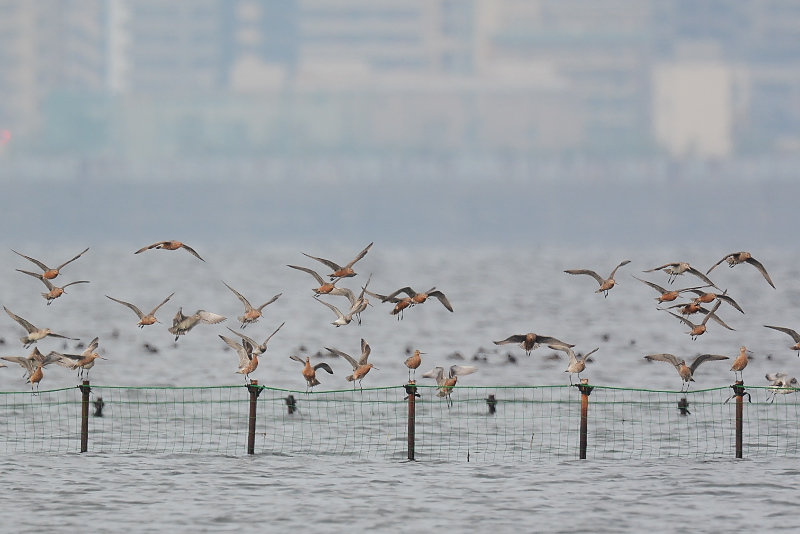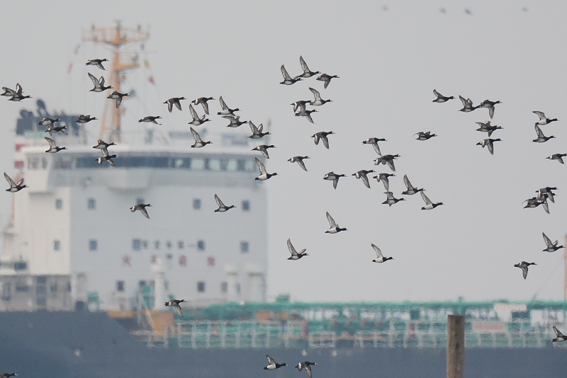 14.04.19 三番瀬 ・オオソリハシシギ ・オオソリハシシギ ・スズガモ ・ダイサギ ・アオサギ 満潮から30分ほど過ぎた時刻に到着し、満潮から4時間ぐらい待ちました。潮干狩りの人たちは集まってきましたが、鳥たちは遠くを飛ぶばかりで、ポールの上から降りてきません。 |