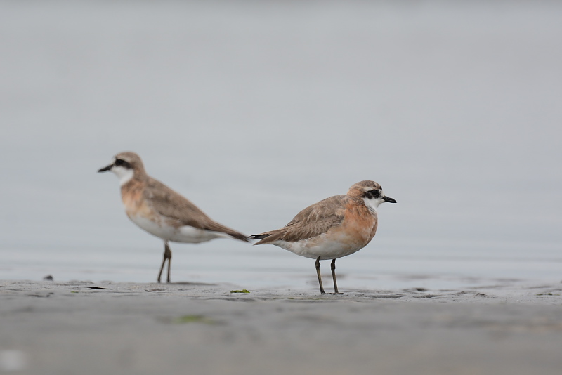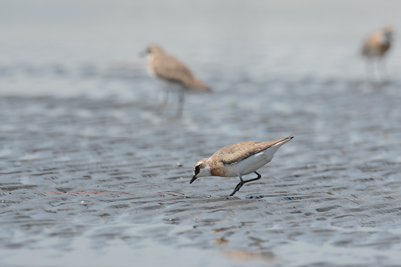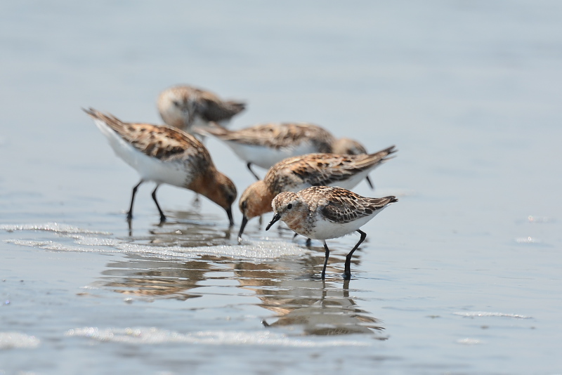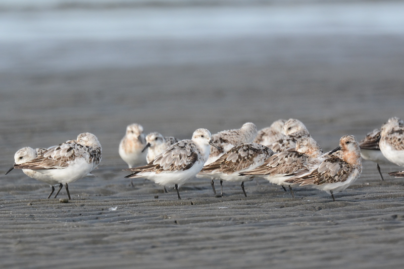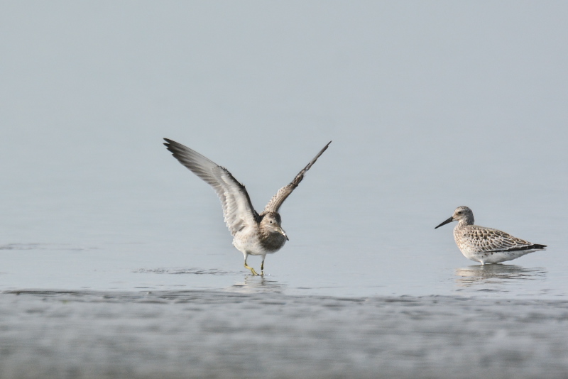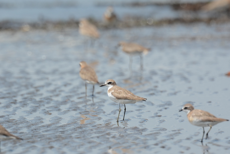 14.08.24 三番瀬 ・ハジロコチドリ ・ハジロコチドリ ・ソリハシシギ ・シロチドリ ・オオソリハシシギ ・オオソリハシシギ ・オバシギ ・オバシギ ・ミユビシギ ・メダイチドリ 朝の涼しい時間帯に行ってみました。潮干狩りの人も多く、すでに車がたくさん止まっていました。 干潟はだいぶ広がっていて、鳥たちもあちらこちらに散らばっていました。最初に網の向こうに見えたのは、2羽のオバシギでした。オオソリハシシギやソリハシシギ、シロチドリなども久しぶりに見て、賑やかさが増してきたという印象です。 スコープで見ていた方がハジロコチドリを見つけてくださり、近づいて写すことができました。オレンジ色の足は遠くからでも目立ちました。暑くなってきたので2時間ほどで引き上げました。 |