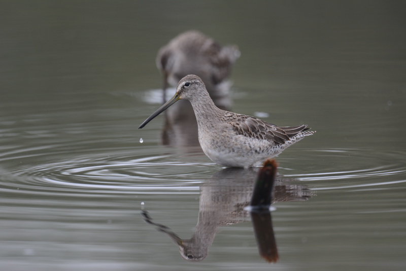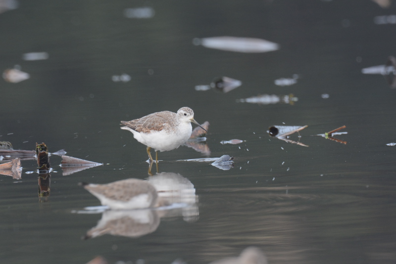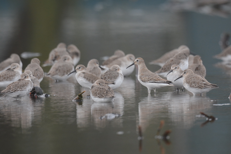 ・オオハシシギ ・ツルシギ ・タカブシギ ・ウズラシギ ・アオアシシギ ・コアオアシシギ ・ハマシギ 濃い霧がかかっていて、ぼんやりと見える程度でしたが、時間とともに霧がはれて見通しがよくなっていきました。霧がはれてもオオハシシギやツルシギ、タカブシギなどはごく近くまできて採餌していました。 |