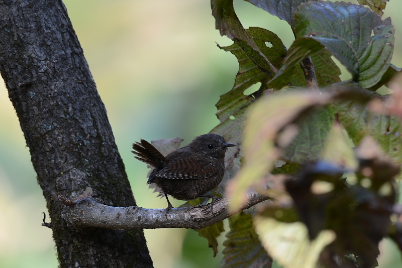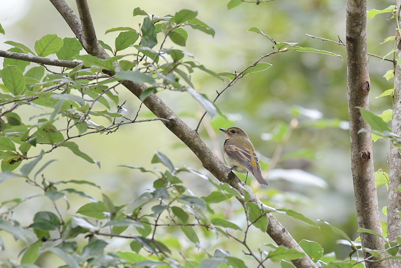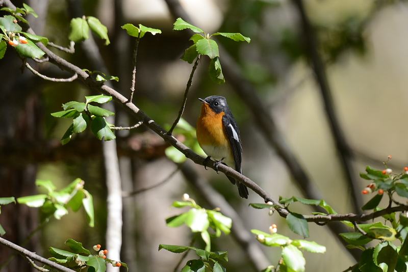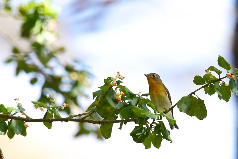 14.10.18-19 長野県 ・ムギマキ ・ムギマキ ・エナガ ・エナガ ・ミソサザイ ・コゲラ ムギマキを見に行くようになって何回目かな。いずれの回も探すのに苦労したり、ちらちらとは見たもののじっくりと見てなかったように思います。今回は、朝現地に到着して歩き出すと、まもなく何人もの人がカメラを構えていて、その先のツルマサキに雄のムギマキがやってきていました。高いところで少し距離がありましたが、光線の具合も良く、よく見えました。実をとると飛び去るのですが、少したつとまたやってきます。何度も見ることができました。しばらく観察した後、そこから移動すると別の場所にも現れていました。今回はじっくりと見ました。 ムギマキを待っていると、エナガの群れやミソサザイ、コゲラも姿を見せました。 |