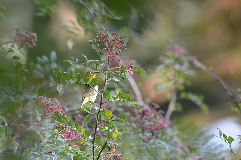 14.10.10-13 いつもの公園 ・メジロ ・ヤマガラ ・キビタキ ・キビタキ ・カケス 久しぶりのいつもの公園でした。ここのイヌザンショウも実をつけていて、しばらく待つとメジロやキビタキがやってきて実をついばんでいきます。ヤマガラもやってきましたが、写真はイヌザンショウがあるところとは別の場所で写しました。 カケスもうるさいぐらいの声を出していて、行き先をじっと追うと地面からドングリをくわえてきました。 |