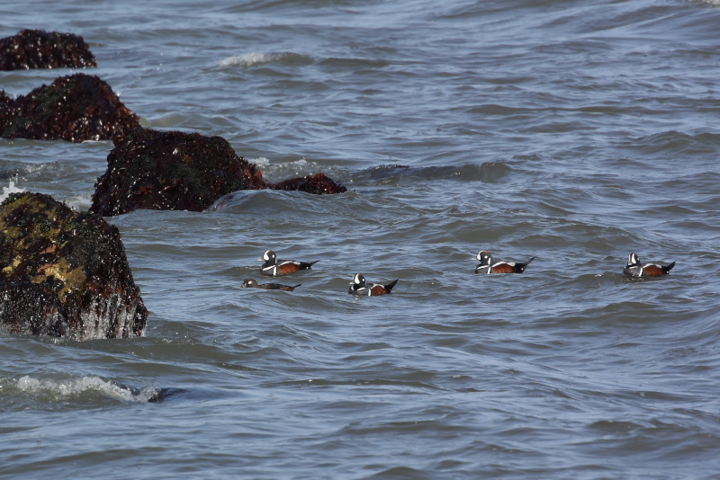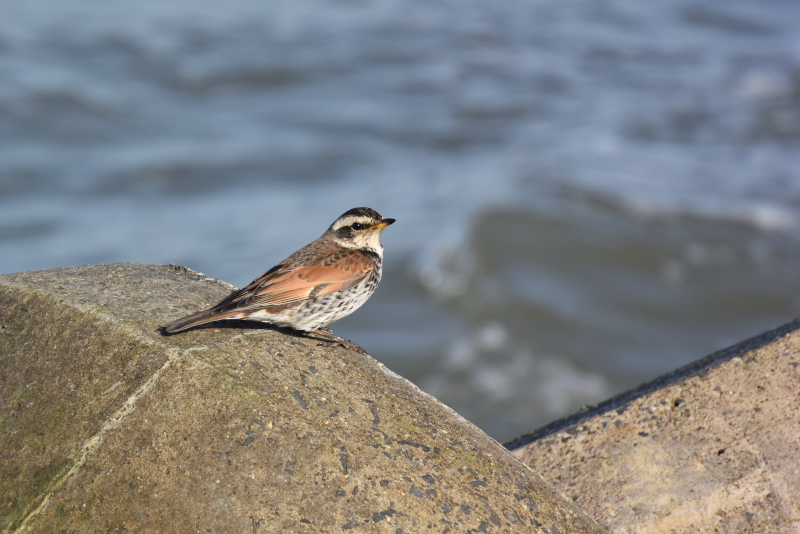 ・ジョウビタキ ・シノリガモ ・ミユビシギ ・ツグミ 突堤の消波ブロックにツグミが、そして少し離れてシノリガモが見えました。 |