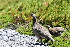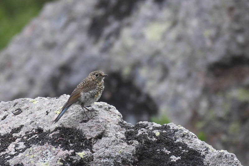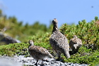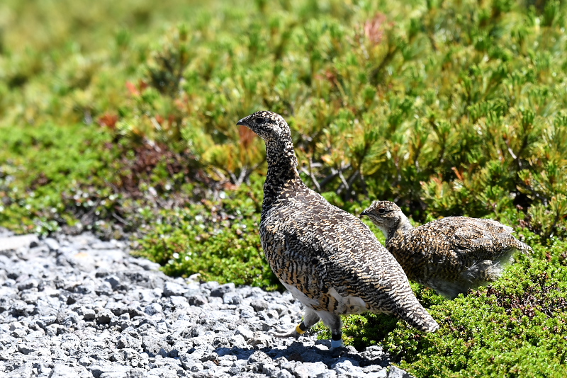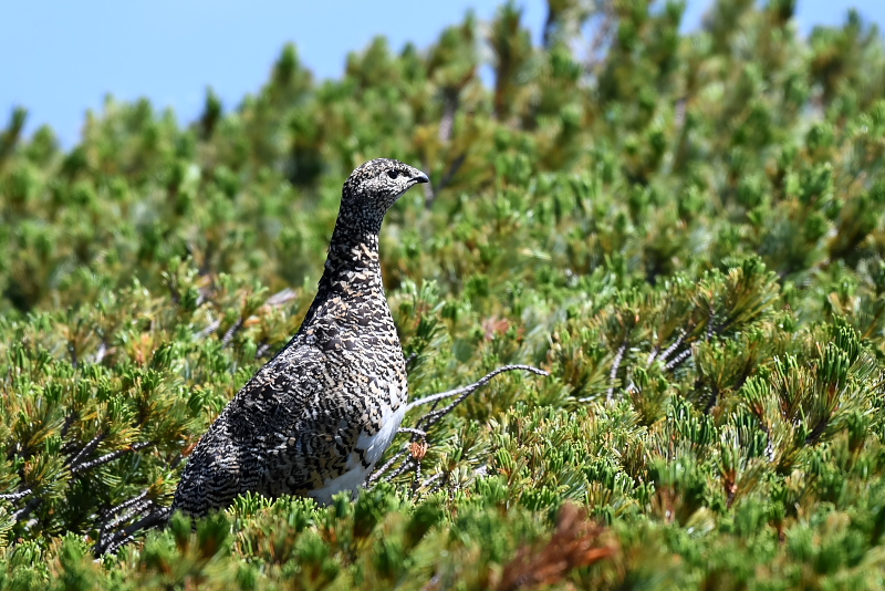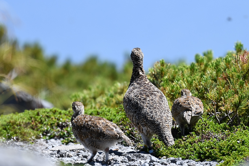 16.08.05-06 乗鞍 ・ライチョウ 乗鞍岳でライチョウに出会いたいと思って2度目の挑戦です。狙いをつけたところで待っていると、下山してきた人が、上に出ていたよ、と教えてくれました。急いで登ると、ハイマツから親鳥が辺りをうかがっていました。一人いたカメラマンが、待っていれば子どもも出てくるよと言います。 果たして出てきました。大きくなった2羽の子どもと親鳥の3羽を確認することができました。人がいる方が安心できるのか、近くでしばらく草の実を食べて、またハイマツの中に入っていきました。 その後、ハイマツからツキノワグマも出てきて、びっくりしました。登山道を横切って斜面を下りていきました。 |