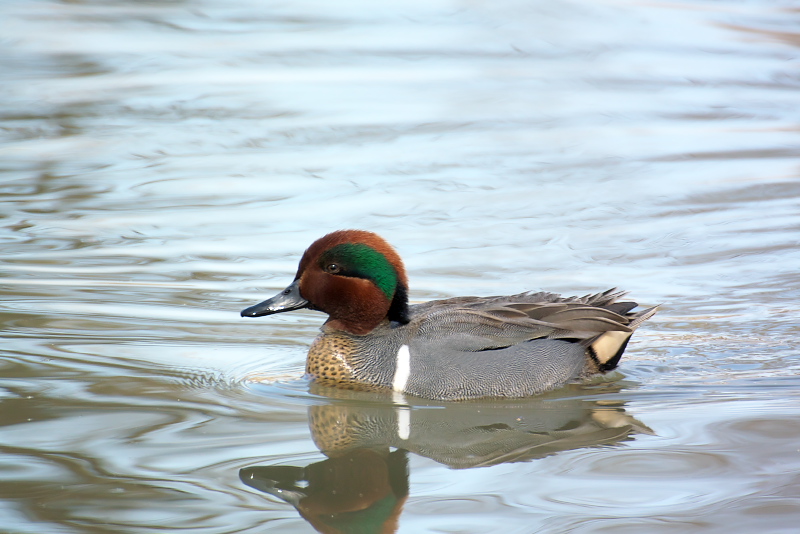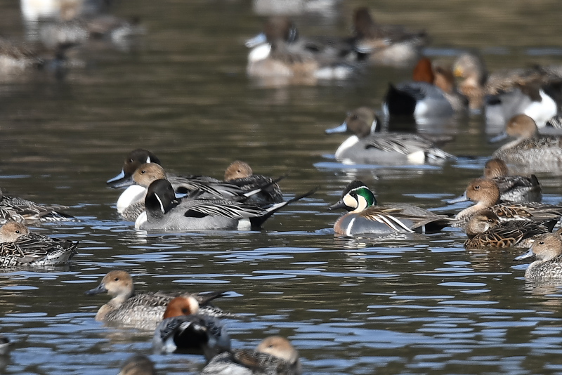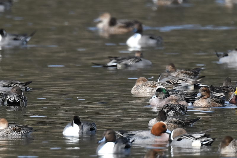 17.03.18 千葉県・茨城県 ・アメリカヒドリ ・シマアジ ・トモエガモ ・トモエガモ ・カワラヒワ ・チュウヒ オナガガモやマガモ、コガモ、ハシビロガモが池を埋め尽くすくらいでした。白鳥の姿はありません。その中にアメリカヒドリ1羽、シマアジ♂♀各1羽、トモエガモ数羽を見ました。アメリカヒドリは、たくさんのカモの中から偶然見つかったようなものです。すぐ寝てしまうので、一度目を離すと再び探すのに苦労しました。シマアジは雌雄で泳いでいました。近くではチュウヒが飛びました。 |