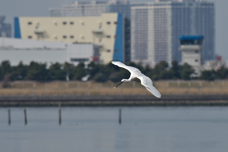 17.03.12 葛西臨海公園 ・ヘラサギ 西渚で待っていると頭上を通過して降り、腹へったといわんばかりにすぐに採餌し始めました。採餌方法は独特で、特大のしゃもじを水中で左右に動かします。持っている図鑑によると、「半開きにしたくちばしを水中から泥の中に垂直に入れ、左右に激しく振って餌をとる(山渓カラー名鑑 日本の野鳥)」とあります。顔まで水に入っているときでも嘴は底まで届いているのでしょう。写した写真を見ると、持ち上げた嘴の間に小魚がはねていることもあります。 |