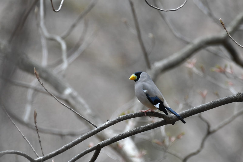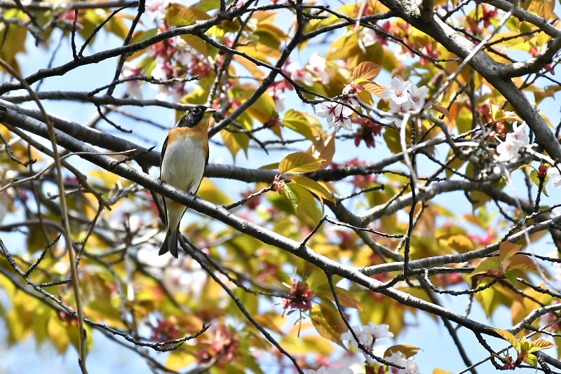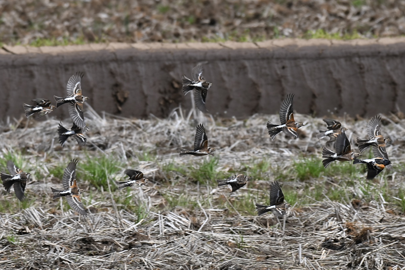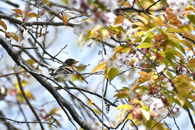 ・アトリ サシバを見たいと思って立ち寄ったところで、予期しないアトリの群れを見ました。これも桜の花の中で何かを食べています。ときどき、短い時間田んぼに降りてきてはまた戻るということをしていました。20〜30羽ぐらいはいたでしょう。 |