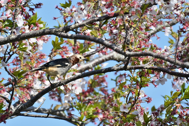 17.04.16 千葉県 ・コムクドリ 桜の木にコムクドリを見ました。5,6羽の小さな群れでやってきて、何かを一生懸命に食べています。図鑑にはクモや昆虫、木の実を食べるとなっていますが・・・。このときは何を食べていたのかなあ。姿を追うのが精一杯でした。姿は見えているのですが、花や葉の中なので、写真に撮るのは以外と難しいことを実感しました。 |