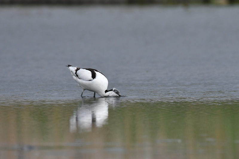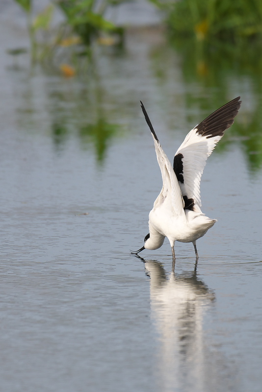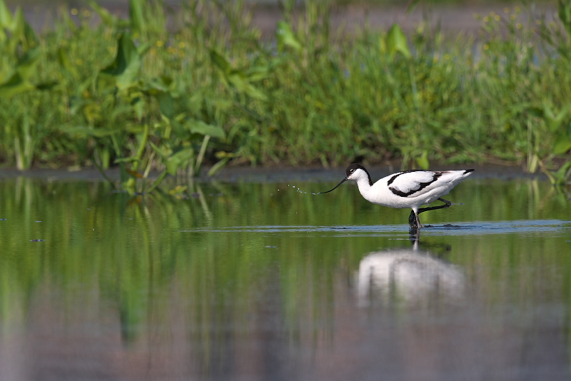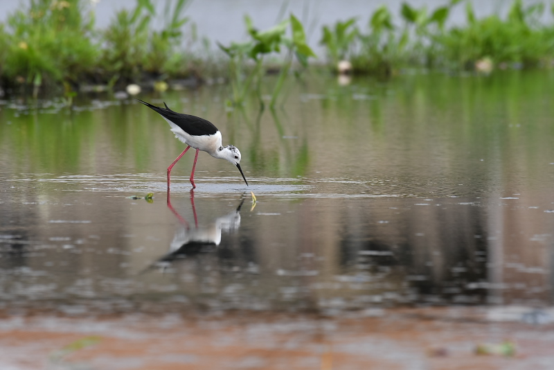 17.05.14-24 千葉県 ・ソリハシセイタカシギ オモダカなどの緑を背景に羽の色が白黒で嘴が反り返った美しいシギ。第一印象はなんと美しいのだろうでした。嘴を水中に突っ込み、突っ込んだ嘴を支点に頭を左右に振って餌を捕っているように見えました。ヘラサギなどともちょっと違うような動きです。ときには頭まで水中に入れます。 |