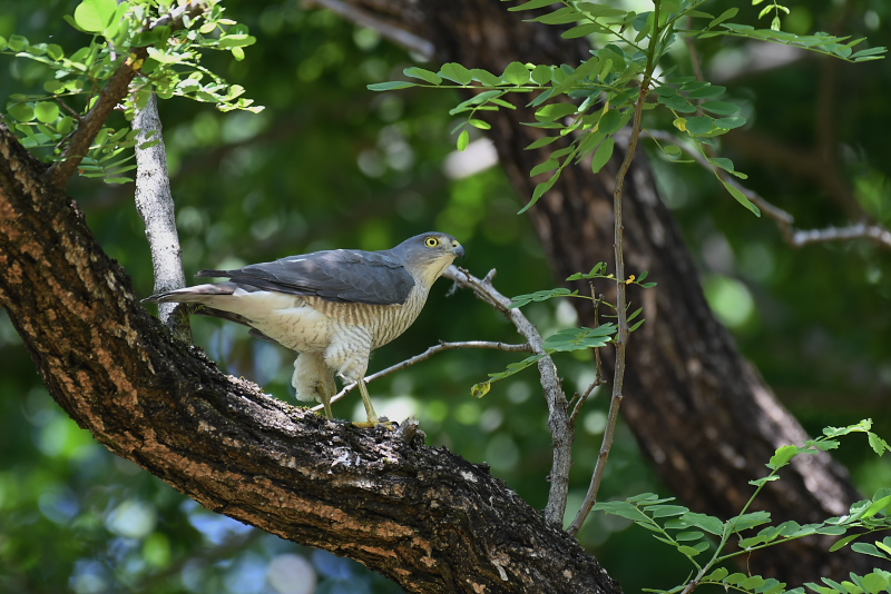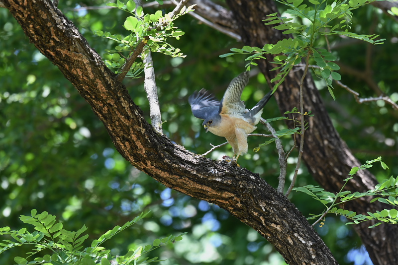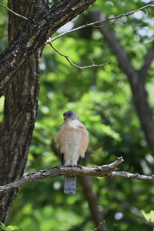 17.05.14-27 千葉県 ・ツミ 雄が獲物をつかんで枝にとまると、雌がやってきて餌をもらっていました。 |