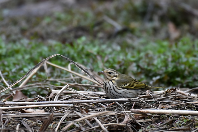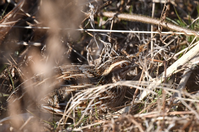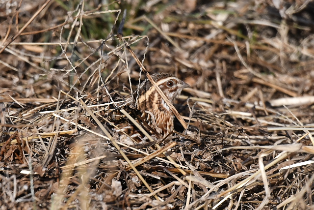 目の前の草むらの中にウズラがいるとのこと。草が動くのですが、顔だけ。じれったい思いで待つと、移動し始めました。でも、よいところには出てこなかった。 |