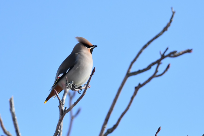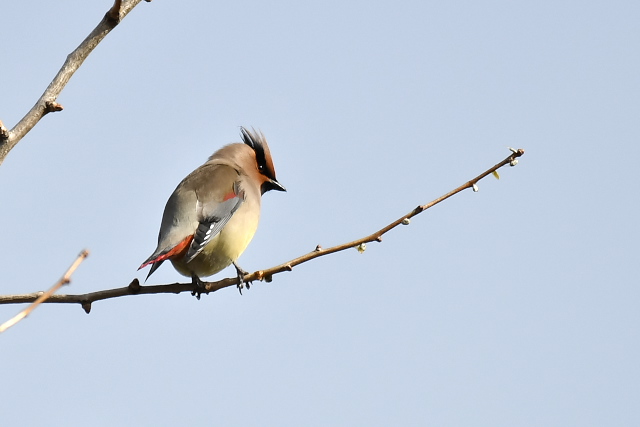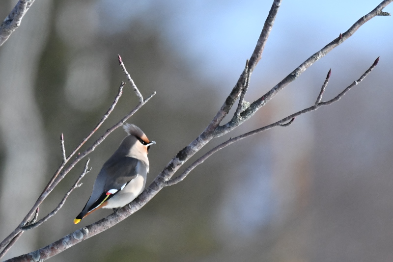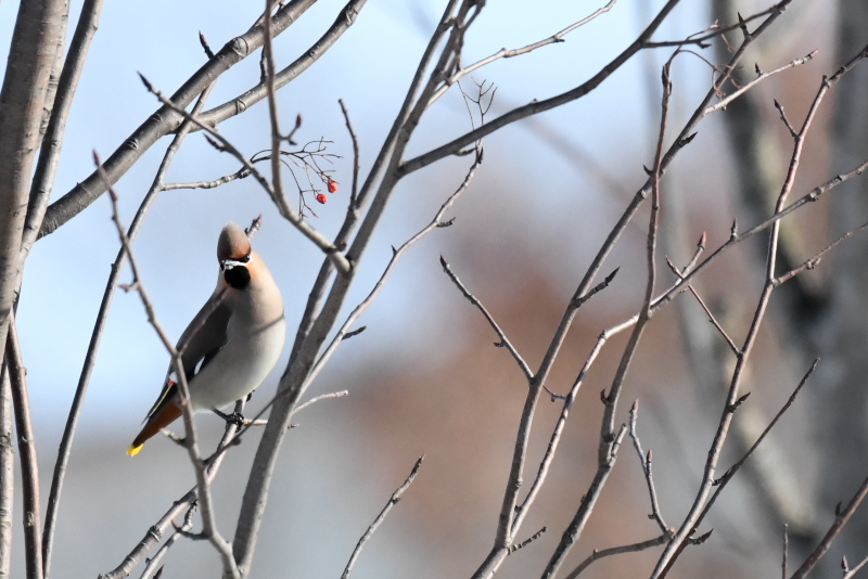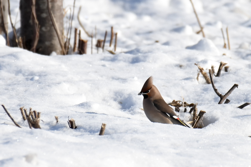 すでに抜けたと思っていましたが、2羽を見ました。わずかに残るナナカマドの実を食べ、地上に降りて雪を食べているように見えました。 |
