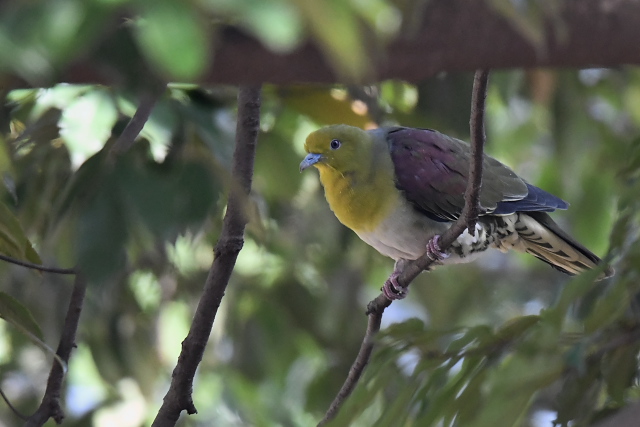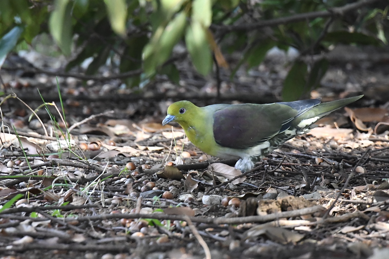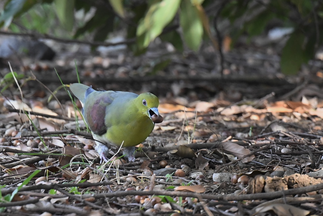 アオバトは警戒して木からなかなか降りてきませんでしたが、腹を減らしたのでしょう、ついにドングリを食べ始めました。手当たり次第に丸呑みしていました。