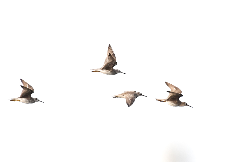 オバシギ1羽は、潮が少し満ちてきて、ミヤコドリやダイゼンなどがいるやや近いところで採餌を始めました。そこへ、ミユビシギの群れもやってきました。 後ろを振り向くと、他の人たちも集まってきて、鳥も人も賑やかになりました。