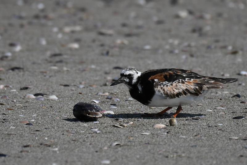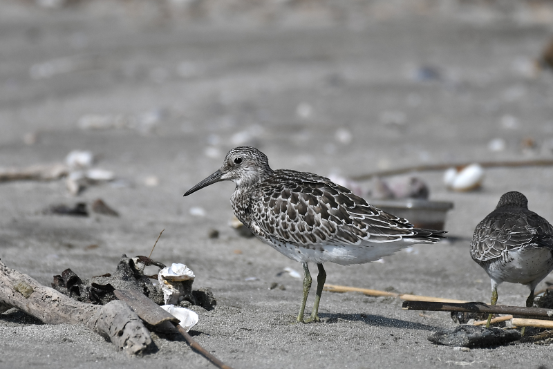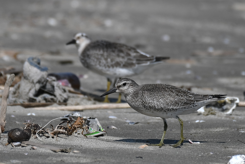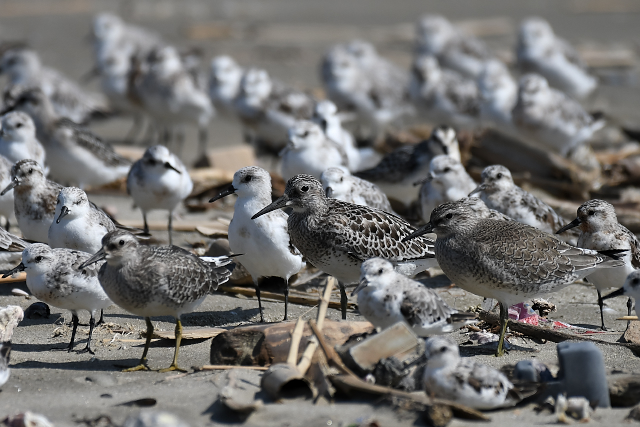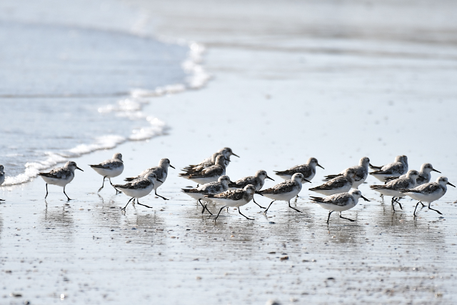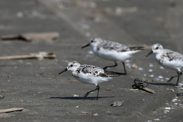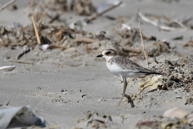 ミユビシギの群れに出会いました。波打ち際にやってきて水浴びをする群れ、打ち寄せられたゴミたまりに集まって休んでいる群れがありました。 メダイチドリは、波打ち際からだいぶ離れた砂の上を走り回っていました。
