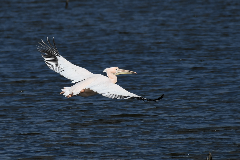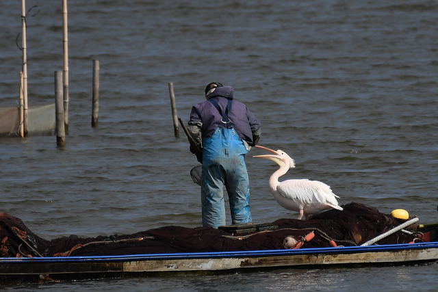 3人の漁師さんが乗った船が岸を離れると、少し間をおいてモモイロペカンが発進。漁師さんに餌をねだっていました。